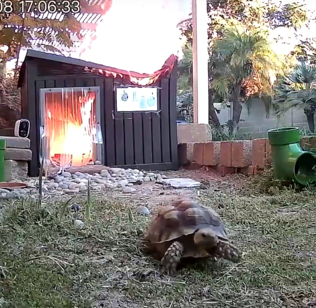A quick move! This tortoise escapes a burning shed from a fallen heat lamp, while the owner was away.