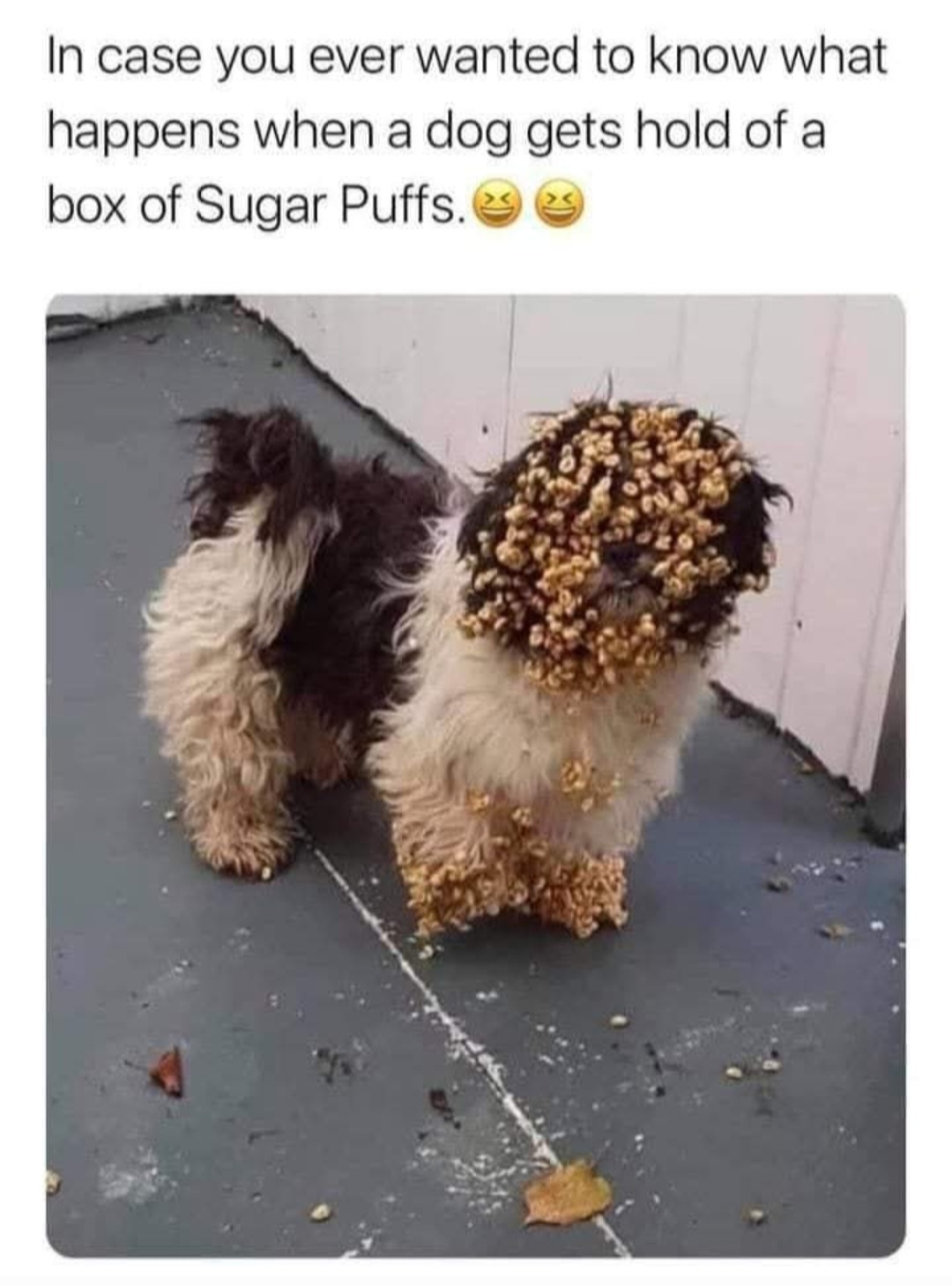This funny meme is a reminder that curious pets get into sweets and treats. So while this was only sugar puffs, too much of anything can be bad.